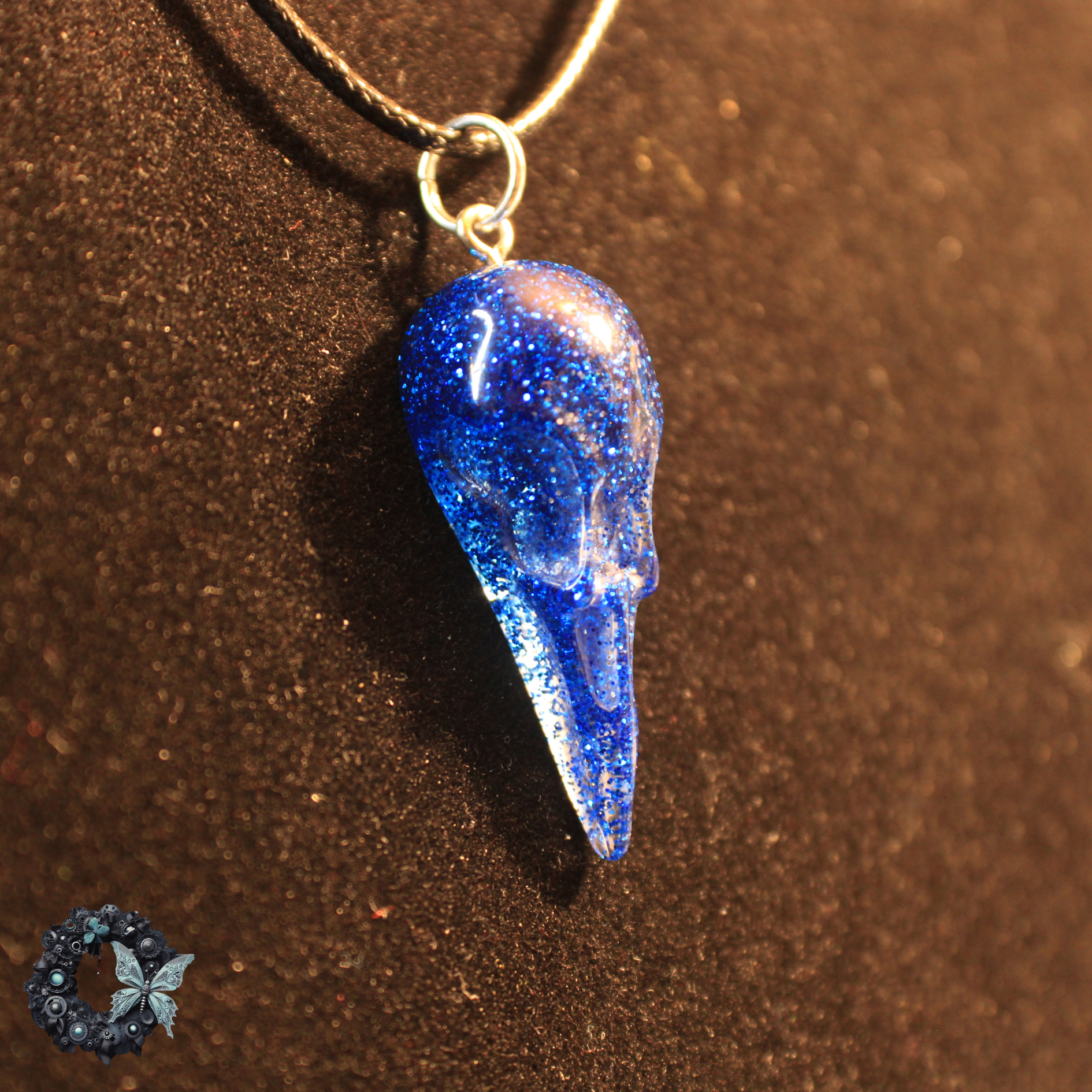 Blue Glitz Pendant – Royal blue skull pendant on black cord (necklace only – last one!)